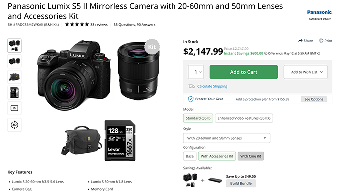 - S5II with 20-60mm and 50mm Lenses at Amazon, BHphoto and Adorama.